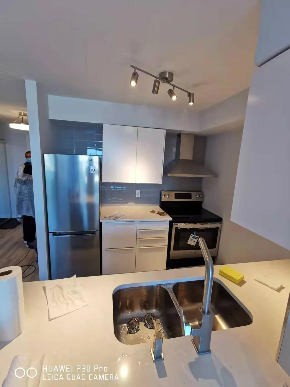 Kitchen Renovation @ York: Modern kitchen with stainless steel refrigerator, white cabinets, black stove, and ceiling light fixture, with a person visible in the background.