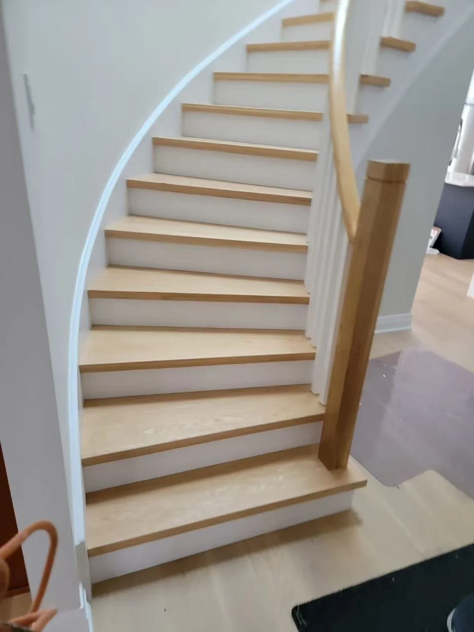 Stairs Relocation @ Markham: Wooden staircase with curved design and white risers inside a home.
