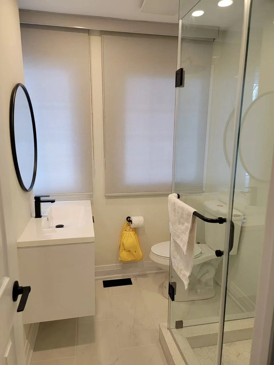 Bathroom Renovation @ North York: Small modern bathroom with a white vanity sink, round mirror, black accents, a window with blinds, a toilet with a yellow bag hanging on the wall, and a glass shower enclosure with a towel on the door.