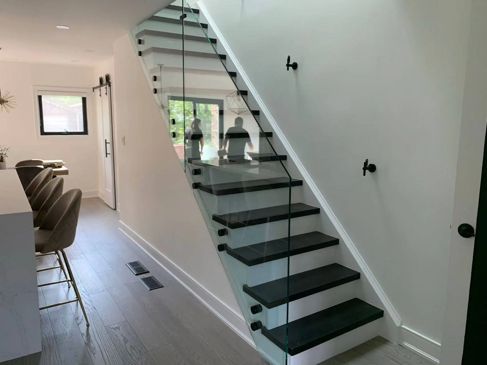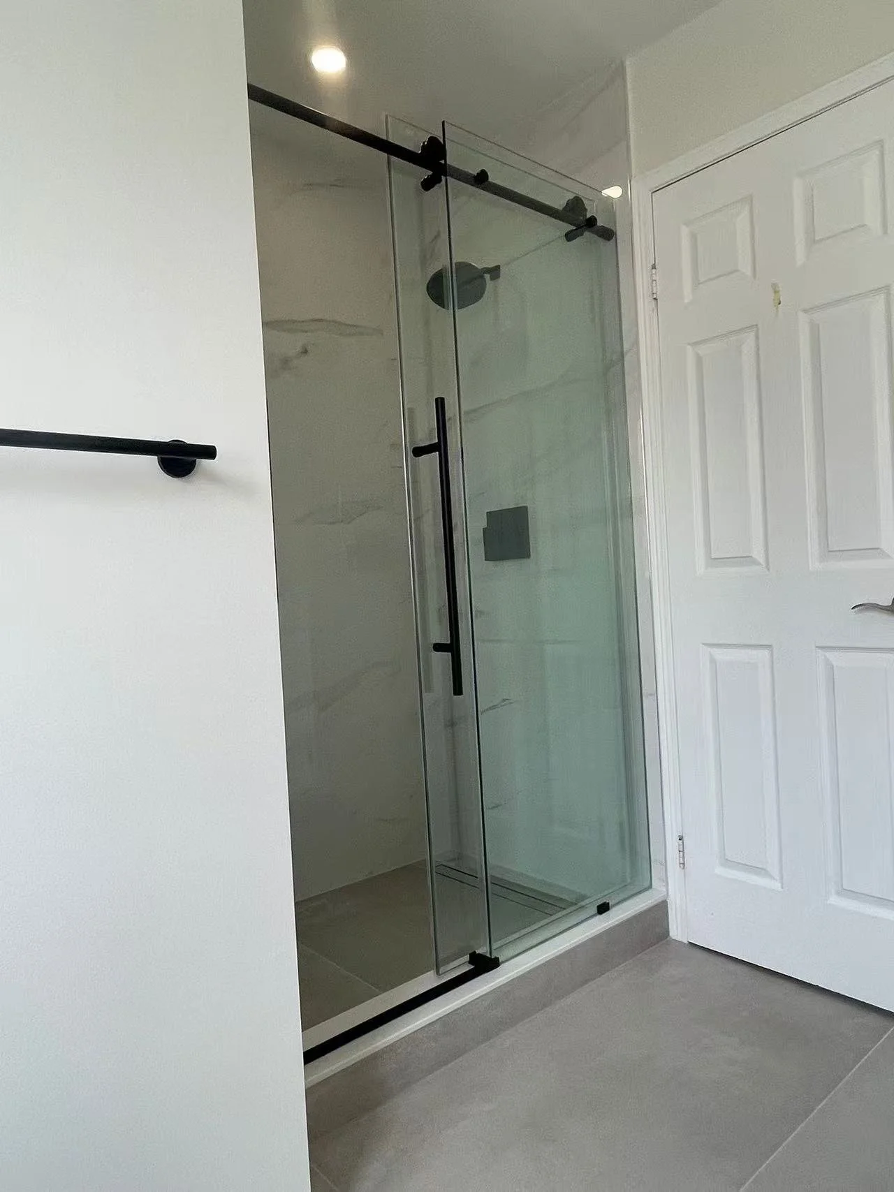 Bathroom Renovation @ Richmond Hill: Modern glass shower with black hardware, white walls, and a white door, in a neutral-toned bathroom.