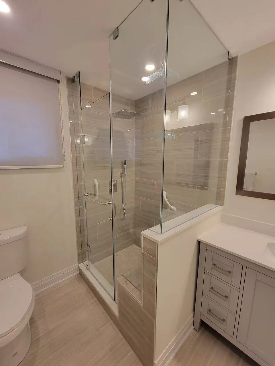 Bathroom Renovation @ Scarborough: A modern bathroom with a glass shower enclosure, a toilet, a vanity with a mirror, and beige tiled floors and walls.