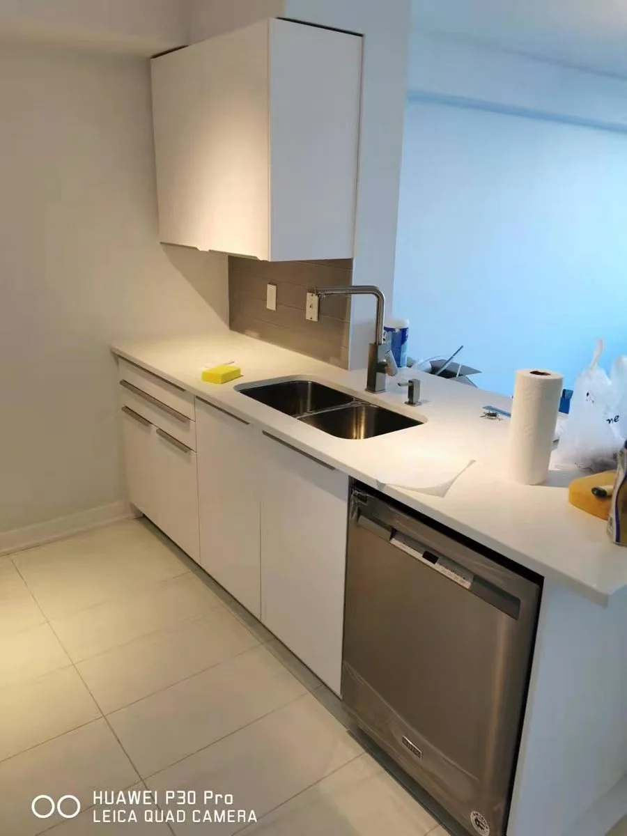 Kitchen Renovation @ Unionville: Photo of a minimalist kitchen with white cabinets, a stainless steel sink, a yellow sponge, paper towels, and a dishwasher on a white countertop.