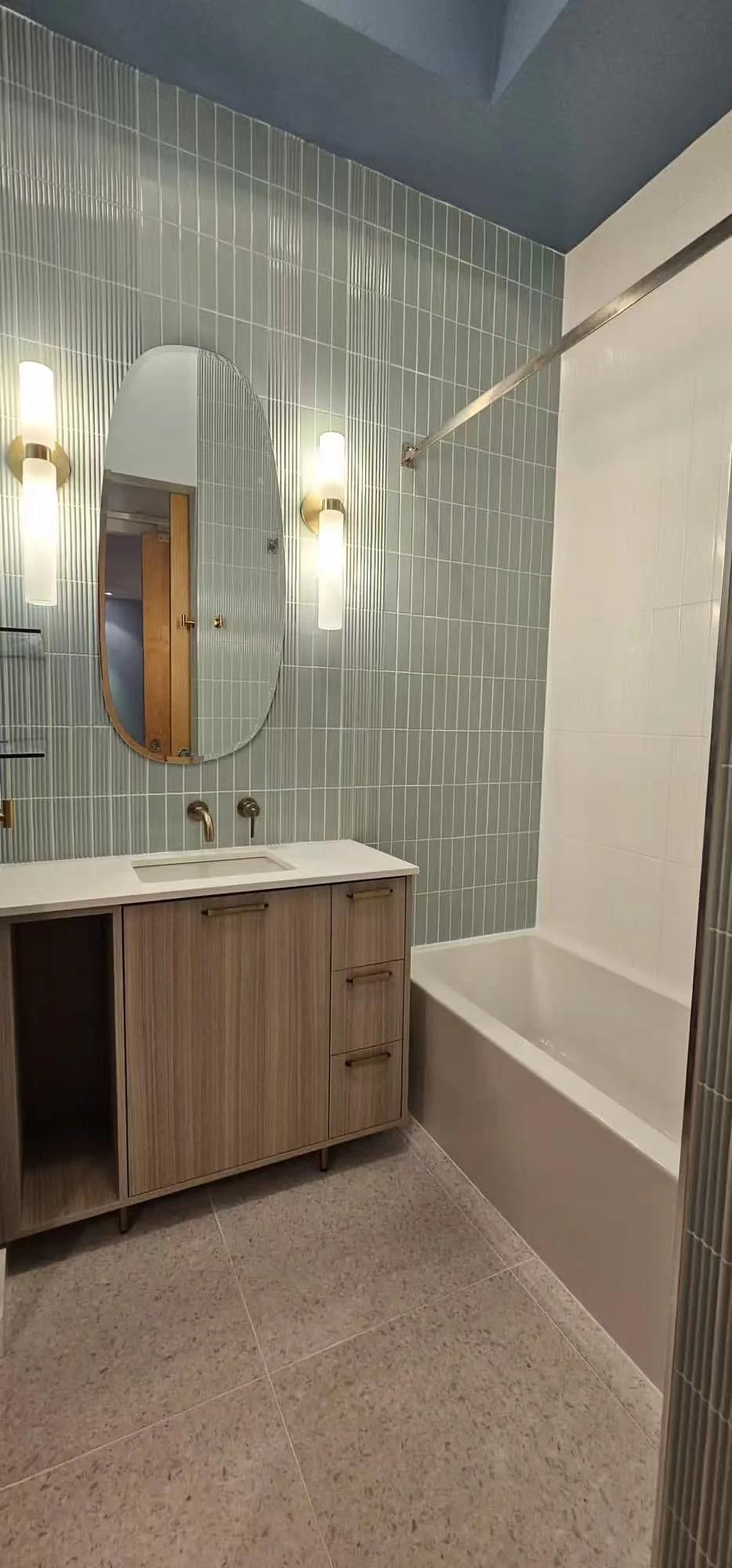 Bathroom Renovation @ Downtown Toronto: Modern bathroom with green tiled wall, oval mirror, wall-mounted lights, wooden vanity with a white countertop, and a bathtub with a sliding door.