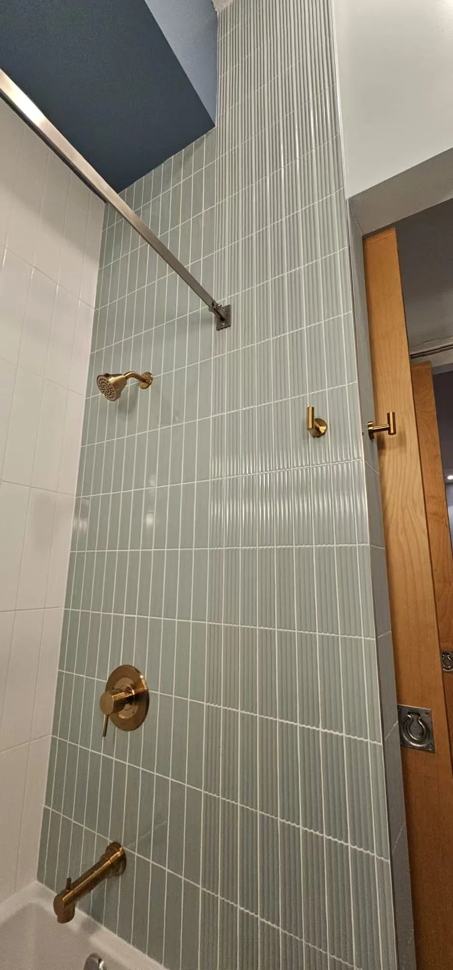 Bathroom Renovation @ Downtown Toronto: View of a bathroom shower area with brass fixtures, a shower head, a control knob, a small hook, and a brass bar for a shower curtain, all mounted on a green tiled wall near a wooden door.