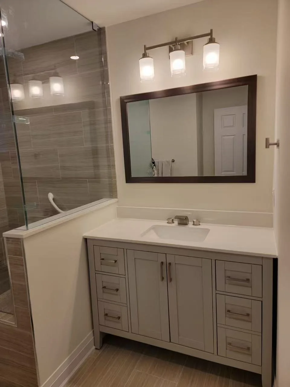 Bathroom Renovation @ Scarborough: Bathroom vanity with a gray cabinet, a white countertop with an integrated sink, and a large mirror above. three light fixtures with frosted glass shades above the mirror. Part of a shower with glass enclosure and beige tiles is visible to the left.