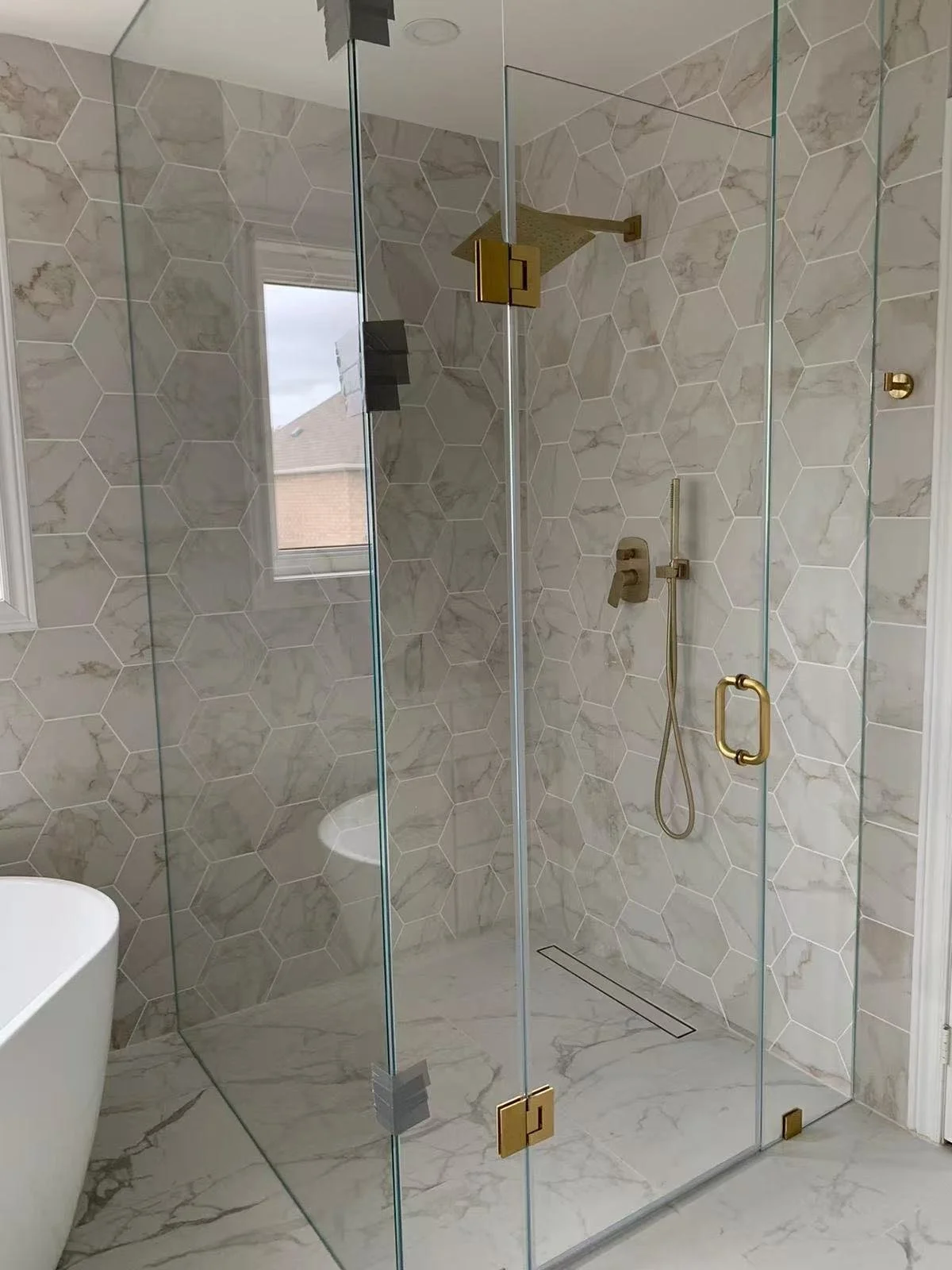 Bathroom Renovation @ Markham: A modern walk-in shower with glass walls, gold hardware, a rainfall showerhead, and marble tile walls and floor.